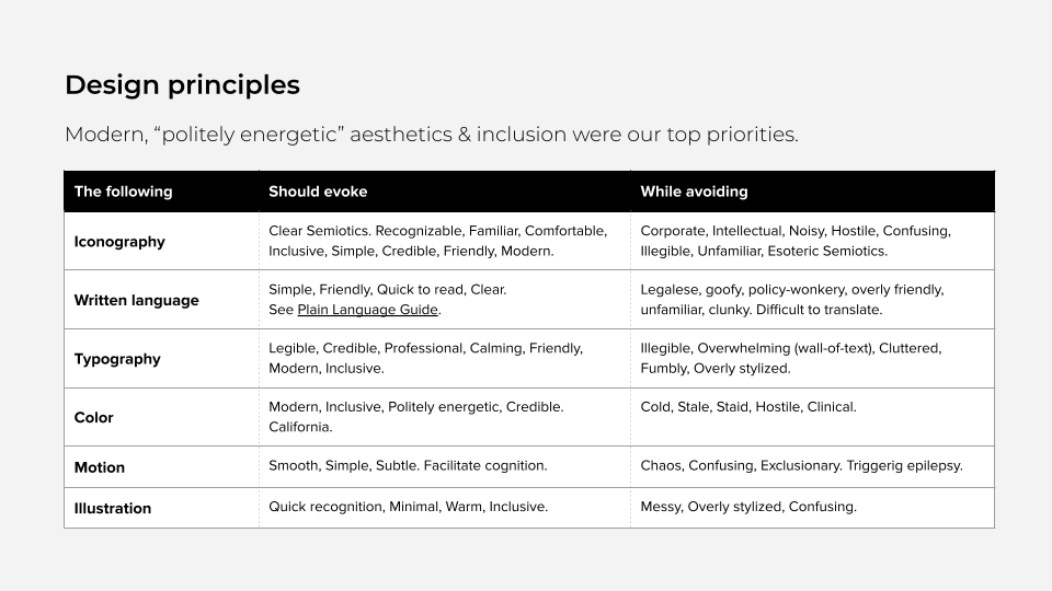 The core team working on the project also changed through the project’s ~9mos. Our PM and my UX Research partner both left the project, while multiple developers, 2 other designers and 1 new researcher joined. Having the blueprint available as a ramp-up guide, a source-of-truth, and as an opportunity for fresh eyes & minds to contribute, proved essential in supporting these changes.